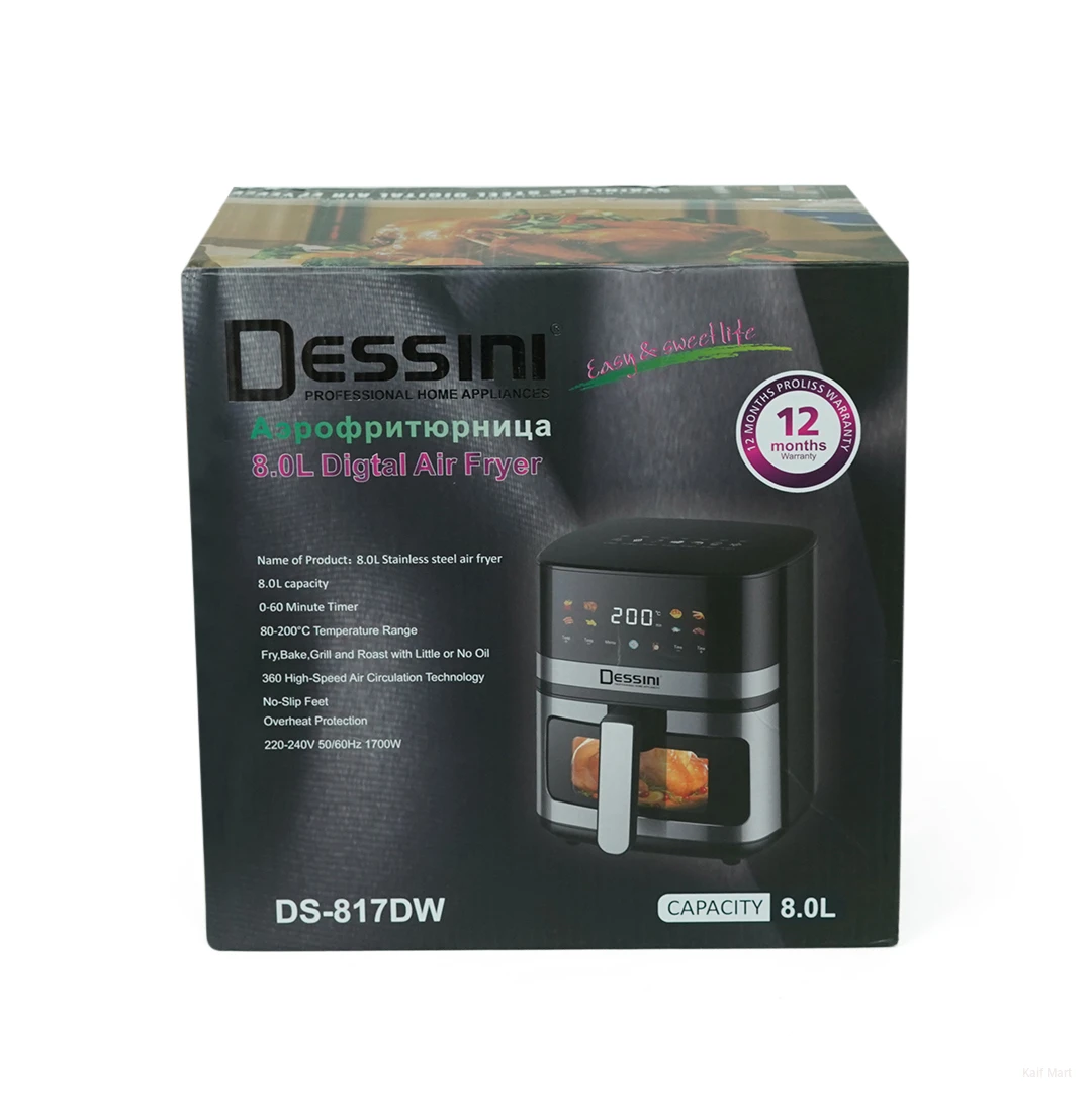 The Dessini 8.0L Digital Air Fryer DS-817DW is a high-capacity, professional-grade appliance designed to provide a healthier alternative to traditional deep-frying. Using rapid air circulation technology, it delivers crispy, delicious results with little to no oil, making it an essential addition to any health-conscious kitchen.